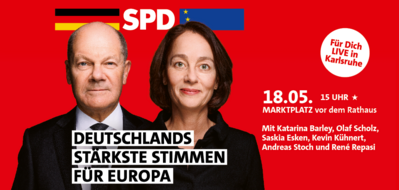 In der heißen Wahlkampfphase der Europawahl kommt die SPD-Spitzenkandidatin zur Europawahl Katarina Barley zu einer Großkundgebung nach Karlsruhe. Mit dabei sind unsere Parteivorsitzende Saskia Esken, Generalsekretär Kevin Kühnert, Bundeskanzler Olaf Scholz, unser baden-württembergischer Spitzenkandidat zur Europawahl René Repasi und unser Landes- und Fraktionsvorsitzender Andreas Stoch.